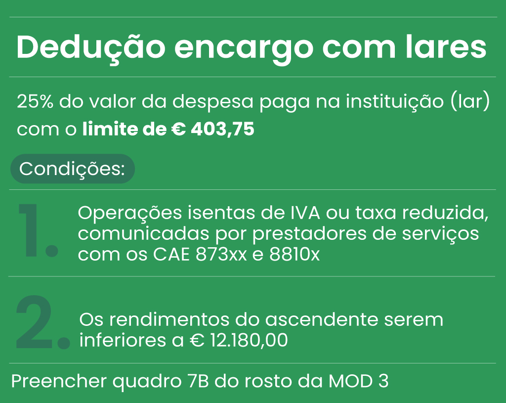 Aqui não é exigida comunhão de habitação. O que releva é o encargo suportado com estruturas de apoio à terceira idade (apoio domiciliário, lares e instituições de apoio à terceira idade). A dedução de encargos com lares é de 25% do valor da despesa paga na instituição com o limite de 403,75 euros.
