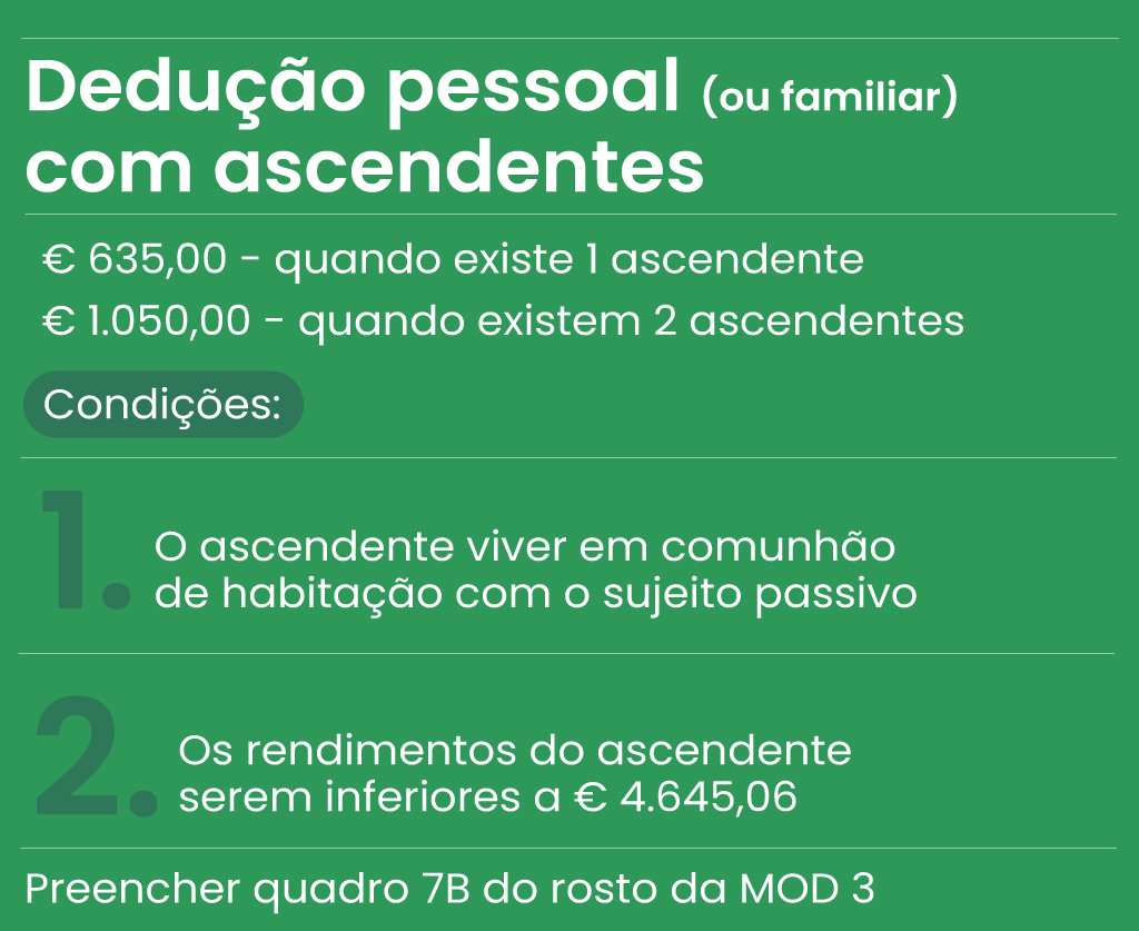A dedução pessoal com ascendentes é de 635 euros no caso de existir apenas um ascendente em comunhão de habitação, e de 1.050 euros (525 euros por cada um) no caso de existirem dois ascendentes em comunhão de habitação com o sujeito passivo. Esta dedução é fixa e aplicada de forma automática desde que reunidas as condições para tal.