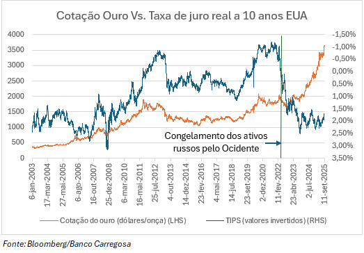 Ainda assim, boa parte da subida do ouro nos últimos anos é justificada pela invasão da Ucrânia pela Rússia em 2022 e consequente “congelamento” das reservas russas no estrangeiro, nomeadamente em divisas ocidentais, marcando uma verdadeira mudança de paradigma. Tradicionalmente, a evolução da cotação do ouro tem estado estreitamente ligada às taxas de juro, em particular às taxas reais nos EUA, medidas pelos TIPS (Treasury Inflation-Protected Securities). Sempre que o rendimento real dos TIPS desce, o ouro tende a valorizar, e vice-versa (ver 1.º gráfico). Desde 2022, contudo, esse padrão alterou-se, passando a contar com uma variável determinante: a procura estrutural dos bancos centrais emergentes, em especial da China. Ao contrário das divisas, o ouro não pode ser “congelado” ou confiscado. Por isso, muitos países do Sul Global têm reforçado significativamente as suas reservas. Essa procura cada vez mais estrutural, sobretudo por parte dos bancos centrais de economias emergentes, tem sustentado a escalada do preço, num movimento de diversificação cambial que procura reduzir a dependência do dólar.