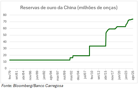A China desempenha hoje um papel central neste mercado. É, simultaneamente, o maior produtor e o maior importador de ouro do mundo, reforçando as suas reservas precisamente para proteger os seus ativos da exposição ao dólar e ao risco de sanções. O gráfico da evolução das reservas chinesas ilustra bem este movimento, com aumentos sucessivos até atingir, no final de agosto, as 74 milhões de onças. A Índia, tal como outros mercados asiáticos, mantém igualmente uma procura elevada de ouro físico, tanto para consumo como para reserva de valor.