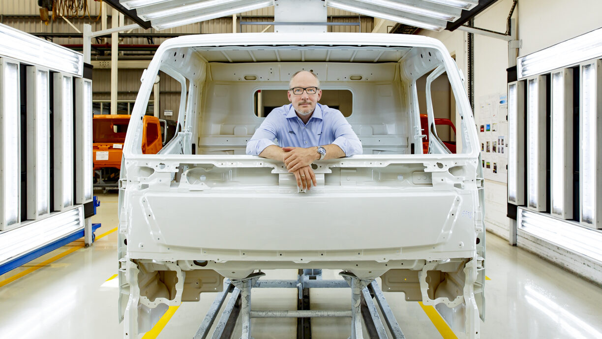 “Precisamos de espaço suficiente para acomodar as diferentes necessidades dos clientes”, destaca o diretor de produção da Daimler Truck. Manuel Baader sinaliza que o eCanter “tem um diferencial elétrico que está muito próximo das rodas para evitar as perdas mecânicas e ajudar nas manobras de marcha-atrás.