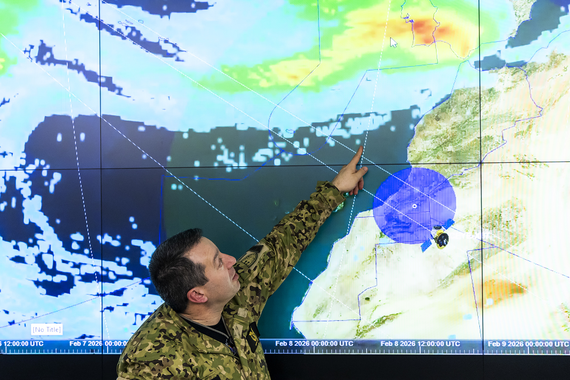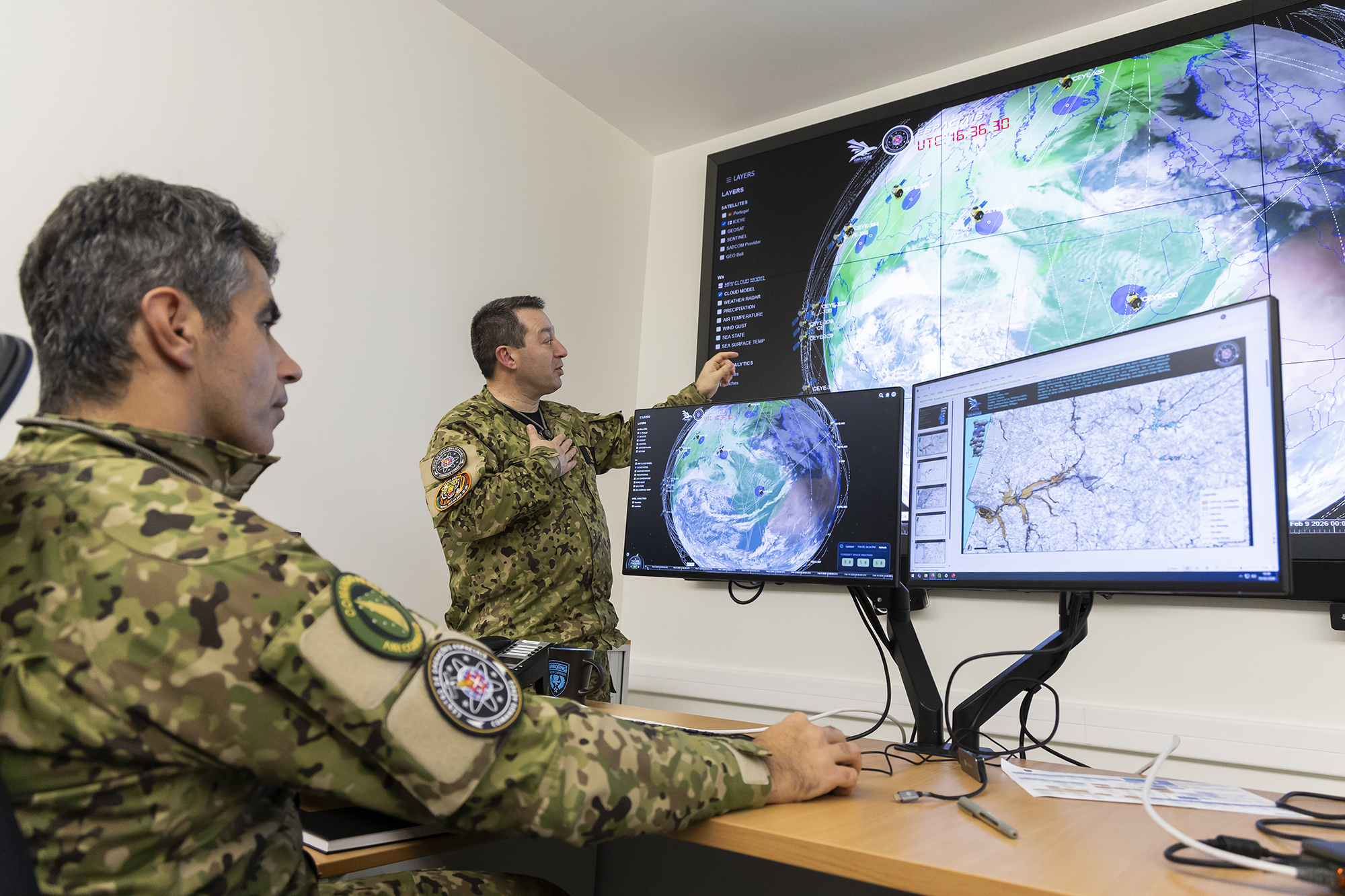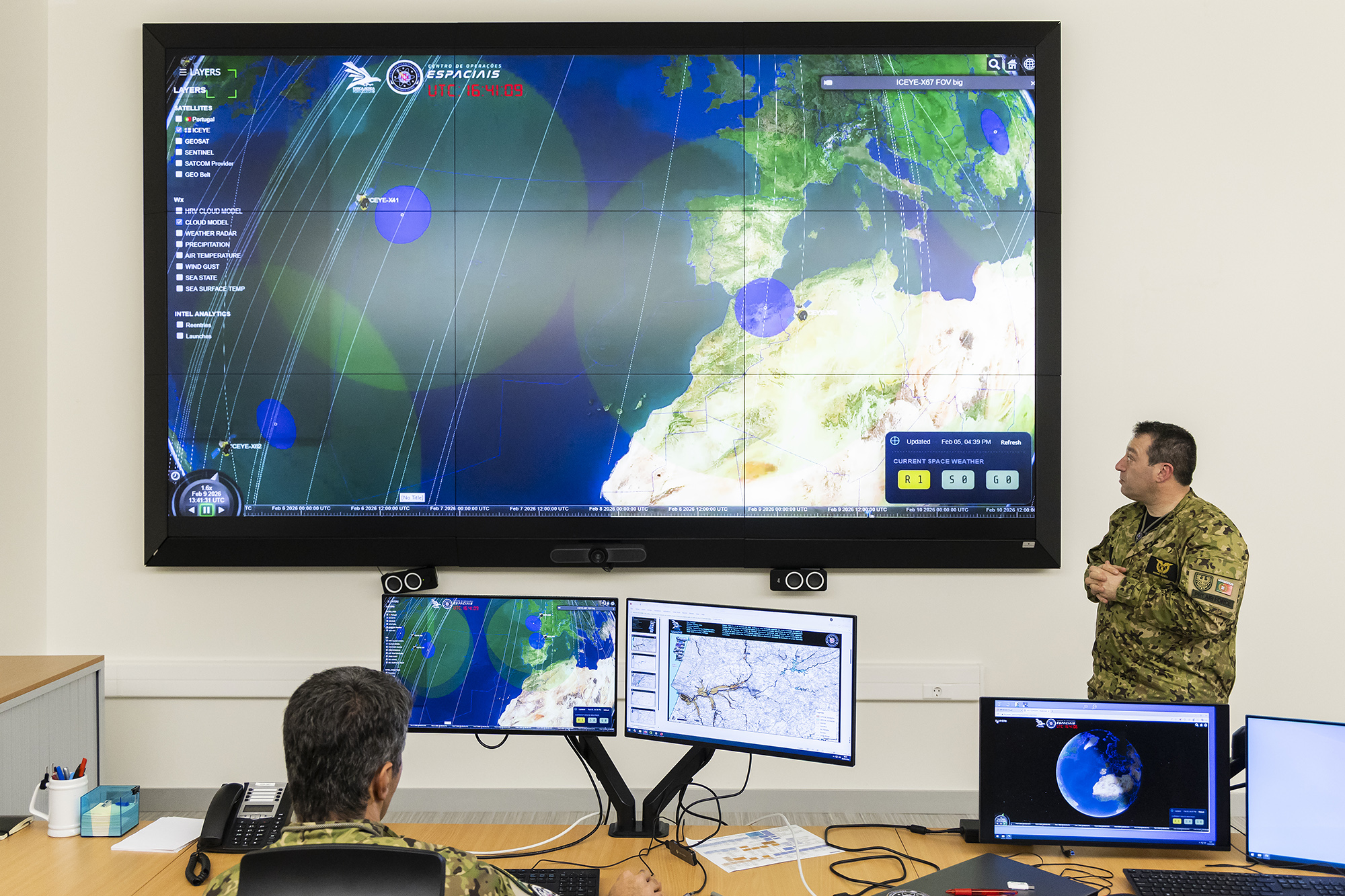 A monitorização do que se passa lá cima no espaço é feita 24h por dia, pelo menos, com duas pessoas em permanência. Garantir ações de vigilância e segurança do território a partir do espaço, mas também, por exemplo, detetar e acompanhar reentradas de objetos espaciais em fim de vida — como foi o caso recente de uma parte de um foguetão chinês com cerca de 15 metros — até se despenharem na Terra. Agora o foco, tem sido prestar apoio à Proteção Civil e às Forças Armadas no apoio à população no pós-Kristin e em plena depressão Leonardo, que está a provocar cheias em várias regiões.