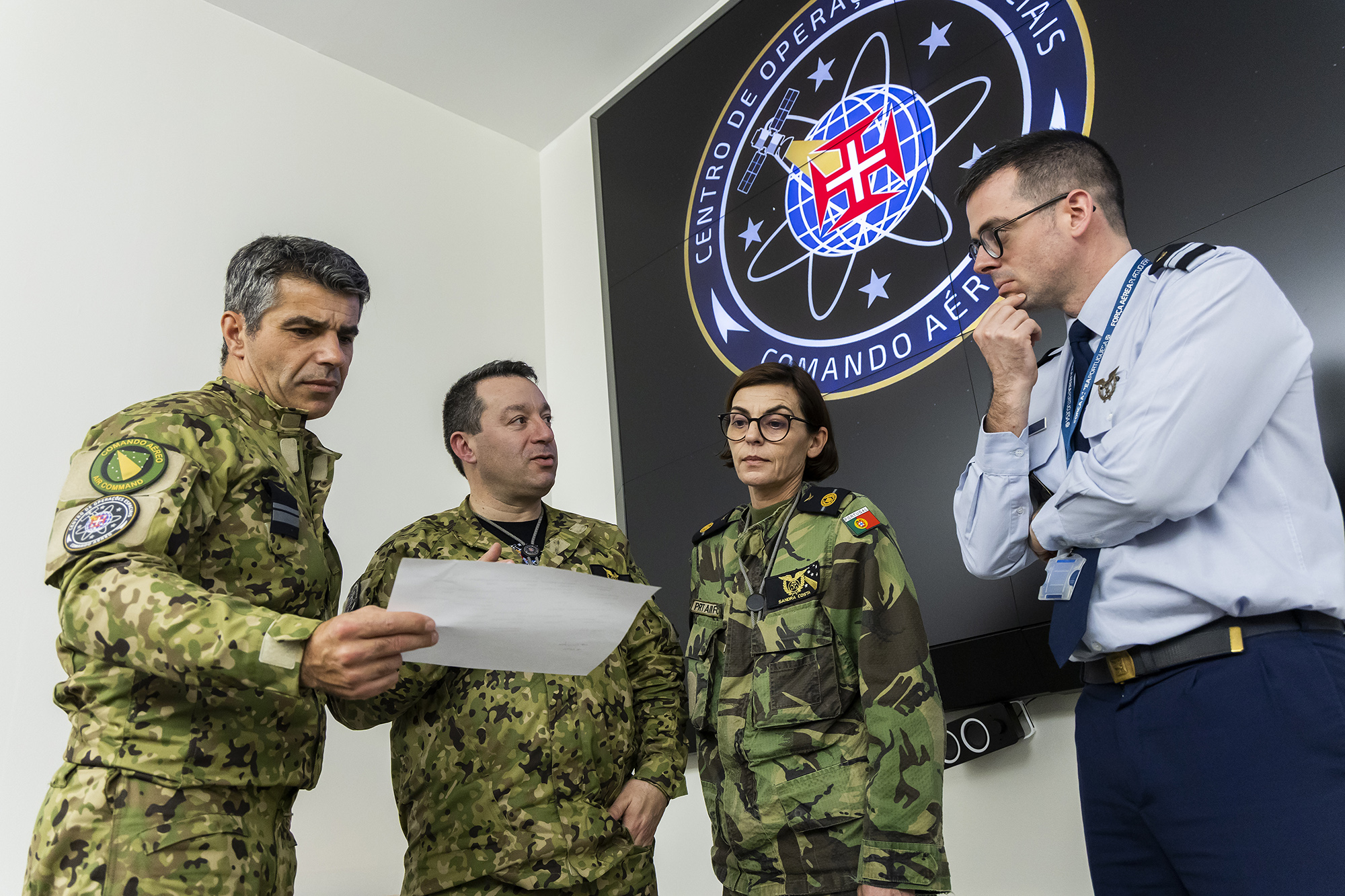É numa sala com 55 metros quadrados que se localiza o ‘cérebro’ do Centro das Operações Espaciais, inaugurado em setembro de 2024. No espaço, por questões de segurança, não entram equipamentos eletrónicos, como telemóveis ou relógios inteligentes — fica tudo num cacifo bem longe da sala de controlo — e para lá chegarmos percorremos um quase labirinto de corredores — pelo menos é que parece para quem não está familiarizado com o layout do edifício — brancos, com calhas de iluminação no teto, intercaladas com tabuletas indicando qual o momento de alerta no Comando Aéreo. Ontem, era o nível de alerta A (de Alfa), o mais baixo.